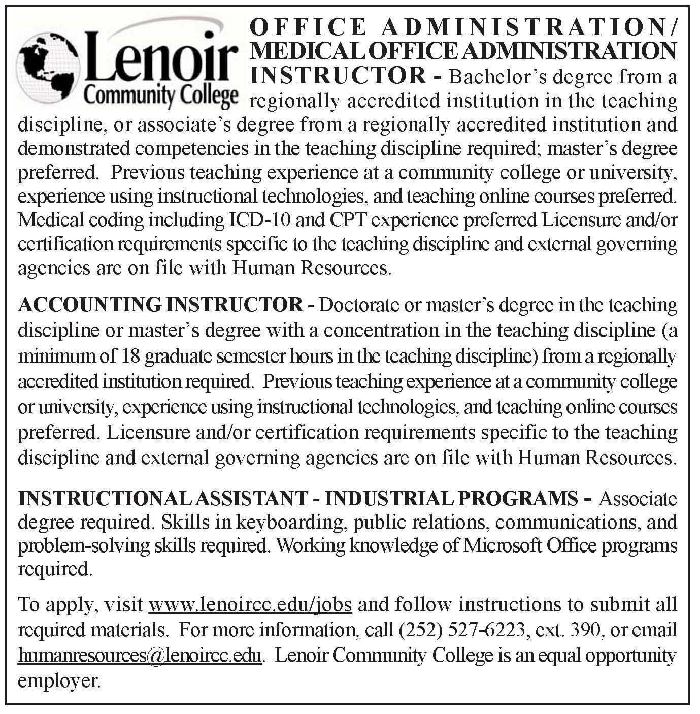 Office Administration/ Medical Office Administration Instructor, Accounting Instructor, Instructional Assistant – Industrial Programs