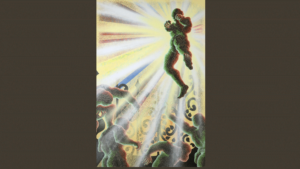 William’s work tends to be more grounded in historical and personal narratives. “Often using his coming of age in Miami with his recently immigrated family as a springboard, William dives into critical inquiries into nationhood and borders, familial memory and mythmaking, violence and tenderness,” writes Delmez. The work Redemption, Resurrection recalls an instance of violent bullying one of William’s brothers endured growing up in Miami. William’s oldest brother ran to avenge the beating; in the work, he is presented as a savior figure with rays of light emanating from behind his body as he fights off assailants.