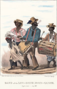 There’s evidence of holiday celebrations since the early days of slavery in the Americas. In the British colony of Jamaica, a Christmas masquerade called Jonkonnu has taken place since the 17th century. One 19th-century artist depicted the celebration, painting four enslaved men playing musical instruments, including a container covered with animal skin, along with an instrument made from an animal’s jawbone.