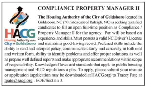 The Housing Authority of the City of Goldsboro located in Goldsboro, NC (50 miles east of Raleigh, NC) is seeking qualified candidates to fill an open full-time position as Compliance / Property Manager II for the agency. Pay will be based on experience and skills. Must possess a valid NC Driver’s License and maintain a good driving record. Preferred skills include the ability to read and interpret policy, communicate clearly and concisely in both oral and written form, ability to identify problems and offer proper solutions, as well as prepare well defined reports and make appropriate recommendations within scope of responsibility. Knowledge of laws and standards that apply to public housing management and HUD regulations a plus. To apply, please submit your resume or application (application may be downloaded at HACG.org) to Tracey Pate at [email protected]. EOE/Section 3