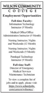 Full-time Faculty: Information Technology Instructor (9 Month), Medical Office/Office Administration Instructor (9 Month), Nursing Instructor, Nights and Weekends (12 Month) Nursing Instructor, Nights and Weekends (9 Month), Paralegal Technology Instructor (9 Month) Full-time Staff: Director of Emergency Medical Services, Maintenance Technician