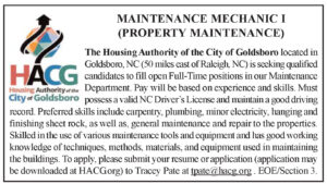 The Housing Authority of the City of Goldsboro located in Goldsboro, NC (50 miles east of Raleigh, NC) is seeking qualified candidates to fill open Full Time positions in our Maintenance Department. Pay will be based on experience and skills. Must possess a valid NC Driver’s License and maintain a good driving record. Preferred skills include carpentry, plumbing, minor electricity, hanging and finishing sheet rock, as well as, general maintenance and repair to the properties. Skilled in the use of various maintenance tools and equipment and has good working knowledge of techniques, methods, materials, and equipment used in maintaining the buildings. To apply, please submit your resume or application (application may be downloaded at HACG.org) to Tracey Pate at [email protected]. EOE/Section 3