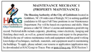 The Housing Authority of the City of Goldsboro located in Goldsboro, NC (50 miles east of Raleigh, NC) is seeking qualified candidates to fill open Full Time positions in our Maintenance Department. Pay will be based on experience and skills. Must possess a valid NC Driver’s License and maintain a good driving record. Preferred skills include carpentry, plumbing, minor electricity, hanging and finishing sheet rock, as well as, general maintenance and repair to the properties. Skilled in the use of various maintenance tools and equipment and has good working knowledge of techniques, methods, materials, and equipment used in maintaining the buildings. To apply, please submit your resume or application (application may be downloaded at HACG.org) to Tracey Pate at [email protected]. EOE/Section 3