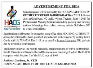 Sealed proposals will be received by the HOUSING AUTHORITY OF THE CITY OF GOLDSBORO (HACG) at 700 N. Jefferson Ave. in Goldsboro, NC until 3:00 pm, Tuesday, June 4, 2024, for Professional Moving Services including packing and moving resident belongings from public housing units in Goldsboro, NC to a new local address.