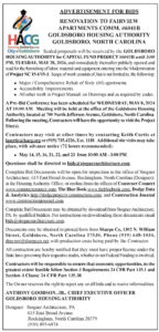 Sealed proposals will be received by the GOLDSBORO HOUSING AUTHORITY for CAPITAL FUND PROJECT #6041B until 3:00 PM, TUESDAY, MAY 28, 2024, and immediately thereafter publicly opened and read for the furnishing of labor, material and equipment entering into the Modernization of Project NC 15-1/15-3. Scope of work consists of, but is not limited to, the following: