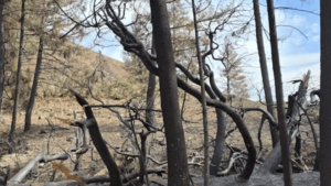 When severe fires burn hillslopes, the high heat from the fires, sometimes exceeding 1,000 degrees Fahrenheit (538 degrees Celsius), completely destroys trees, shrubs, grass and structures, leaving behind a moonscape of gray ash. Not only that, the heat of the fire actually burns and damages the soil, creating a water-repellent, or hydrophobic, layer.