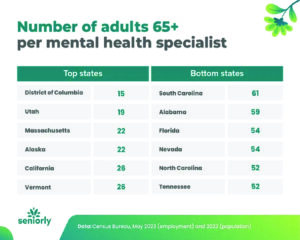 According to SAMHSA, under 40% of older adults with mental health or substance use problems get treatment. A dearth of supportive specialists in an area can exacerbate these challenges. Washington, D.C. is the best for this metric, with just 15 older adults per mental health specialist, while South Carolina is the worst, with 61 seniors per specialist in the state.