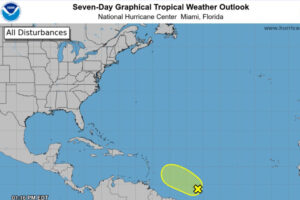The forecast in the NHC’s 7-Day Graphical Tropical Weather Outlook, shows the wave track continuing over open water, with no watches or warnings currently in effect for any land areas.