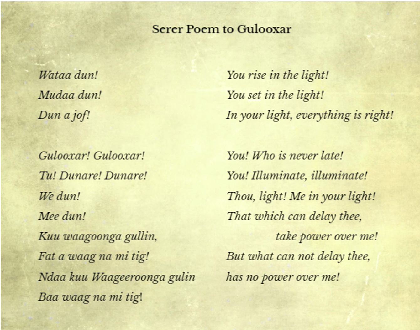 Though Phillis Wheatley had little recollection of her time in the Gambia, she shared one memory—a simple act of her mother pouring out water before the rising sun. This memory was possibly of her mother offering prayers to the sun. The Serer people of West Africa prayed to the sun or “Gulooxar.” It is interesting to speculate how Phillis’s writing might have been influenced were she able to explore the traditions of her people.