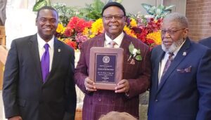 Mt. Zion Baptist Church Pastor Dr. Serenus T. Churn Sr. holds Psi Phi Chapter Citizen of the Year Award, flanked
