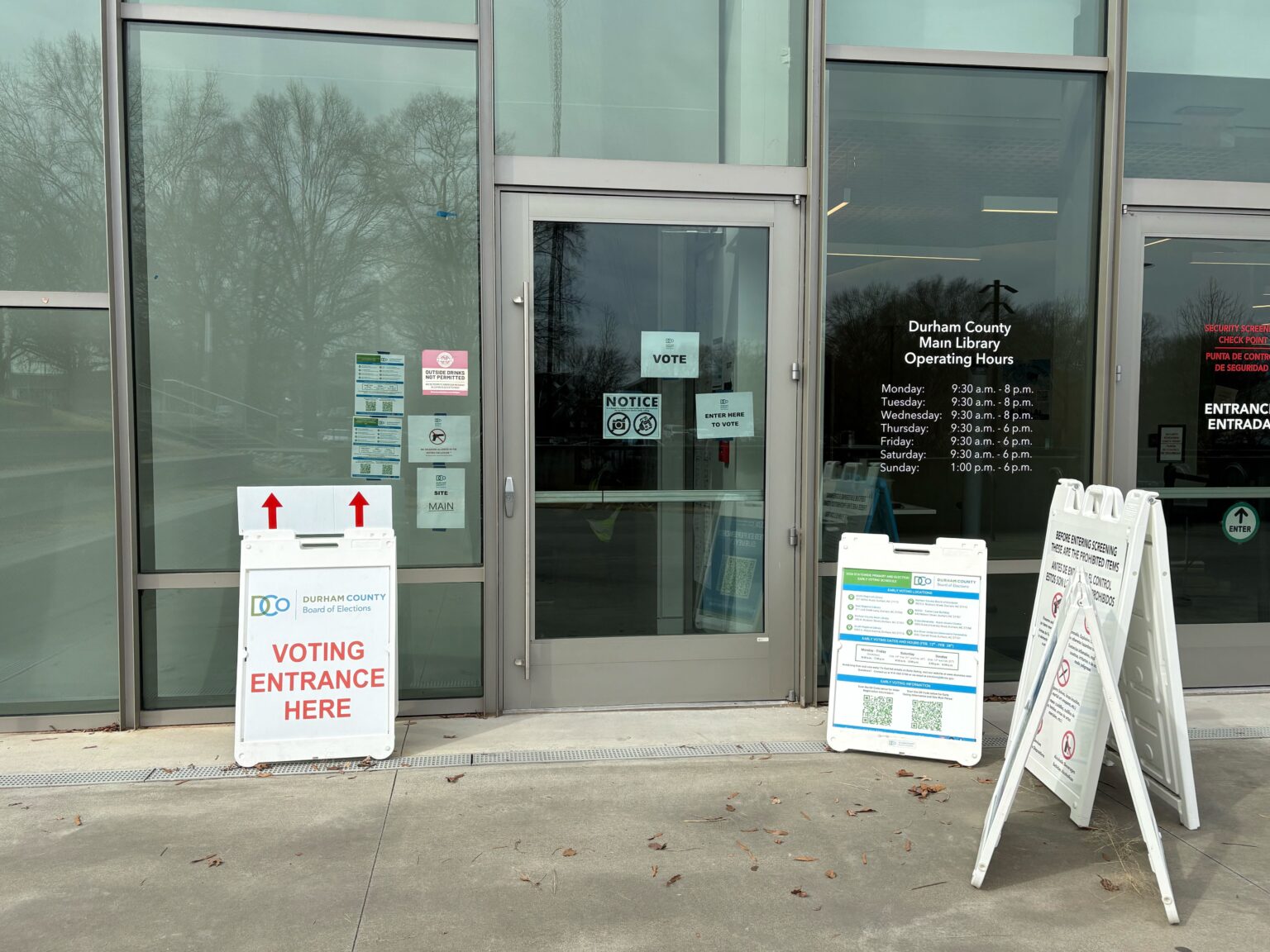 The entrance to the Durham County Main Library, where voters cast their primary ballots on Feb. 12, 2026, the first day of early voting. (Photo: Brandon Kingdollar/NC Newsline)