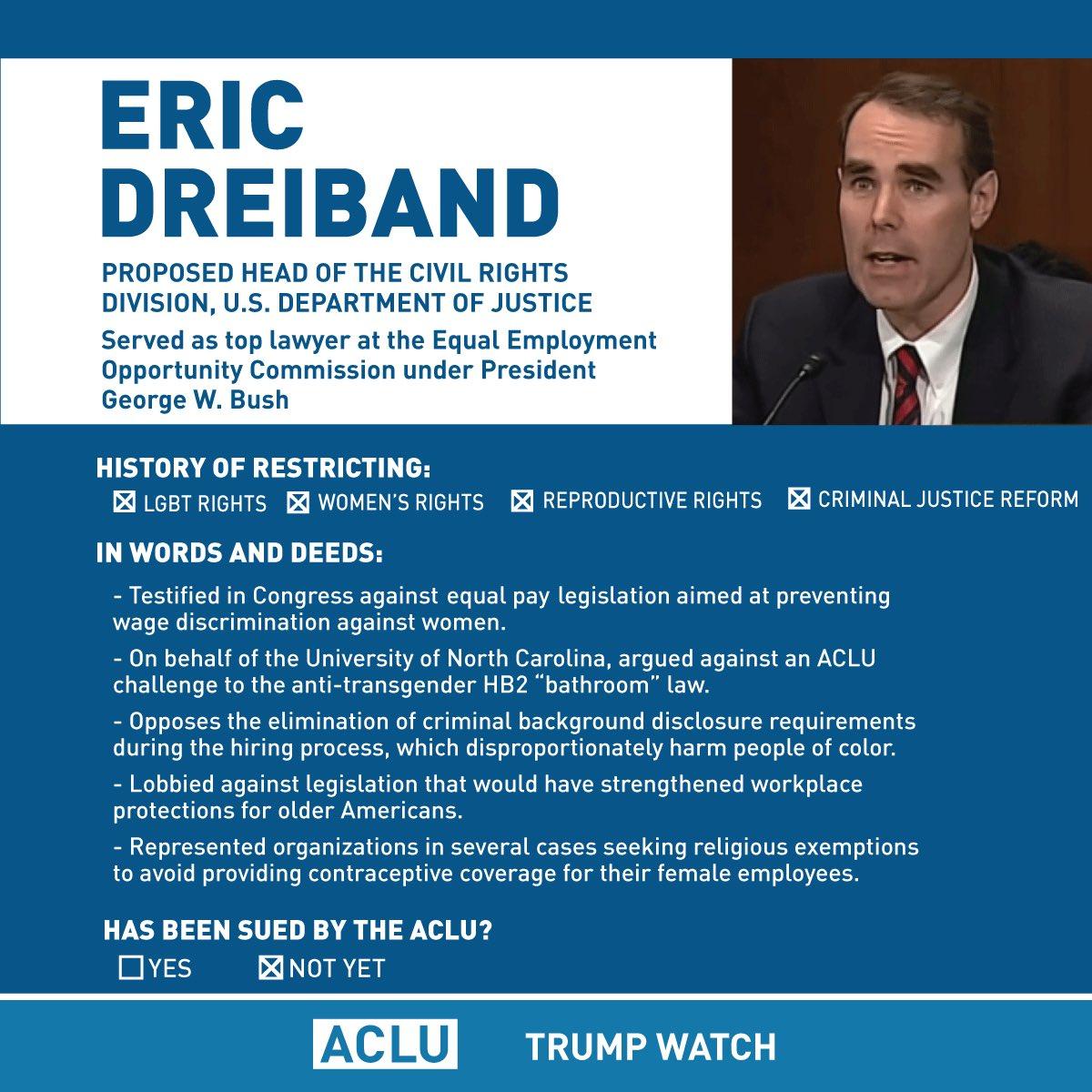 “When I led the Justice Department’s Civil Rights Division under President Obama, we made it our mission to protect the rights of all Americans – from prosecuting hate crimes and workplace discrimination to fighting voter suppression and holding police departments accountable. Eric Dreiband’s career is anathema to that mission. Not only does he lack the experience necessary to lead such an important division, he has also fought aggressively against critical civil rights legislation,” Perez asserted in a statement.