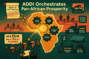For years the African Diaspora Development Institute (ADDI)—founded by Dr. Arikana Chihombori-Quao—has been described as a “big-tent” movement capable of convening presidents, pastors, venture capitalists, and village chiefs. Imagine that tent expanding until every initiative we’ve covered—Right-of-First Refusal (RoFR) laws, raw-export bans, JOBS-Act crowdfunding, NBCC capital, NBLC legislation, and Black & Global compliance tech—fits under a single strategic roof. What follows is a 750-word thought experiment set in 2035, 10 years after ADDI succeeds in synchronizing those pieces into one Pan-African economic flywheel.